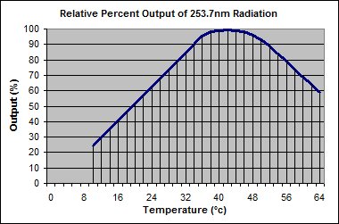 This graph illustrates the effect of tube temperature on ultra violet output.
